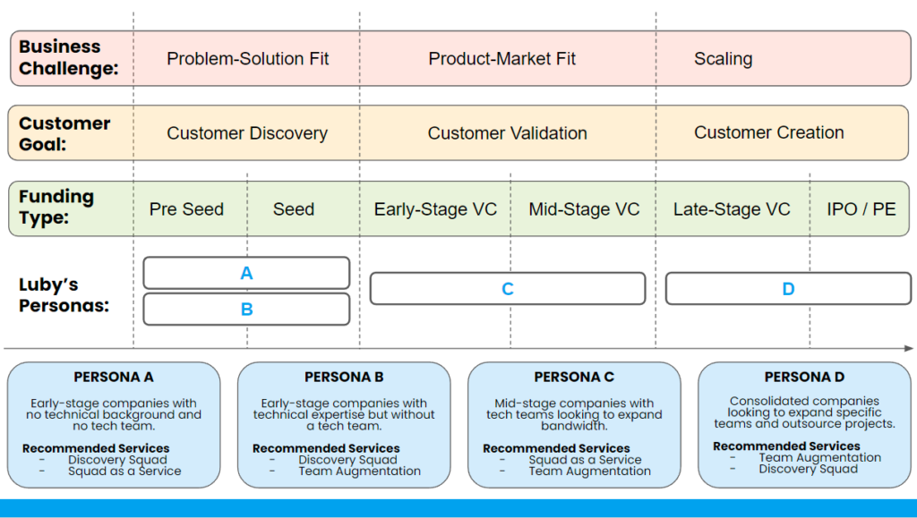 Consequently, today we are able to address the tech needs of companies with varying team sizes, business challenges, customer goals or even funding stage, as you can see in our persona chart below: