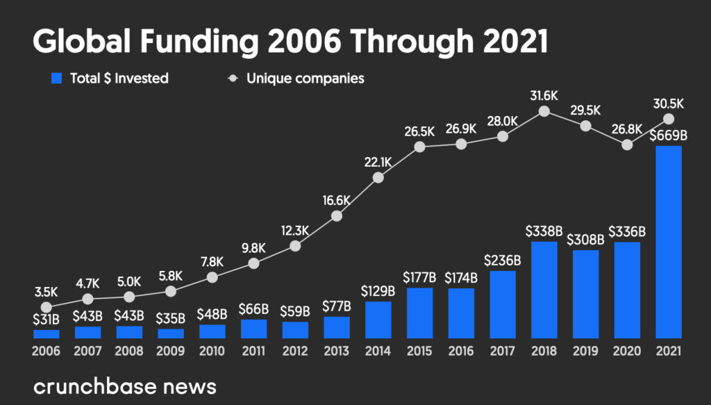 And for the last two years, a lot of volatility was poured into this mix due to the covid-19 pandemic, its inherent lockdowns, remote work policies and the disruption of supply chains. However, the end result of that wasn’t exactly what one would expect out of turbulent times and the pandemic ended up becoming a catalyst to tech companies valuation growth, eventually generating even bigger rounds of VC funding into many different types of companies, which can be perfectly seen in the image below taken from the article “What We Learned About Venture Funding During The 2008 Financial Crisis And The Pandemic As The Markets Face Fresh Turmoil“, written by Gené Teare.